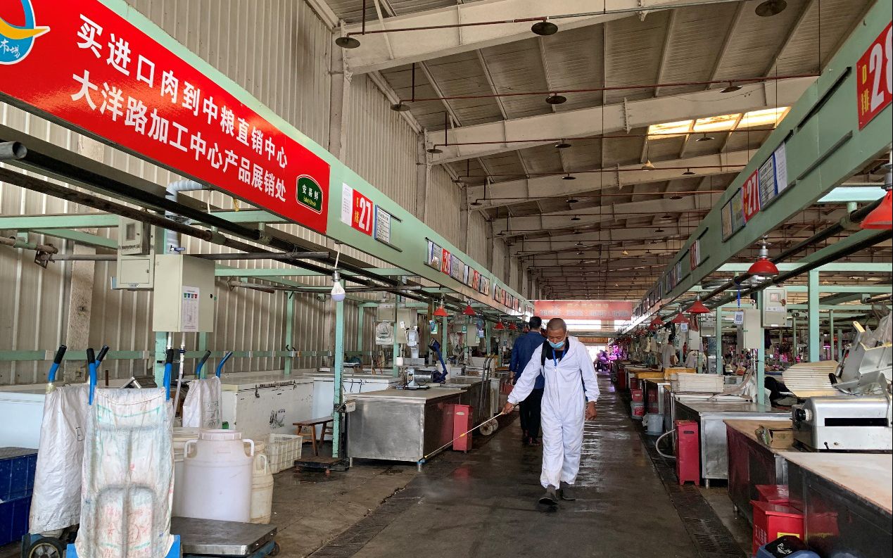 在市场牛羊肉交易厅里,身穿白色防护服,背着消毒水的工作人员,正在对市场进行消杀。