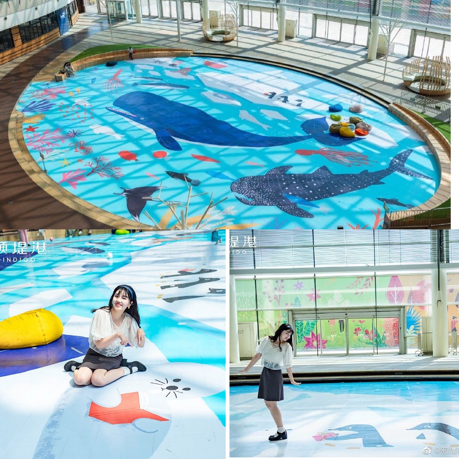 即日起至6月23日,颐堤港携手人民美术出版社插画师“豌豆先生”将商场内的“冬季花园”打造成一个巨大的“水族馆”。从空中俯瞰这里更像一片蓝色的海洋,面积达到34m×24m,是“豌豆先生”印制过的最大尺寸的作品。这个水族馆中有鲸鱼、海豚、海豹等各种可爱的海洋生物,你可以发挥你的想象力与它们完成一幅独一无二的合影。