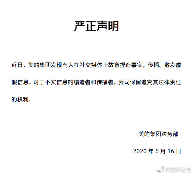 新京报贝壳财经讯 6月16日,针对日前有网络传闻美的集团君兰生活村闯入者为“美的供应商”,美的集团在官方微博发布声明称:“近日,美的集团发现有人在社交媒体上故意捏造事实,传播、散发虚假信息,对于不实消息的编造和传播者,我司保留追究其法律责任的权利。”公司方面还表示,美的集团与供应商一直有着良好的合作关系,结款周期优于行业水平,并由美的旗下的资金中心统一结算支付。
