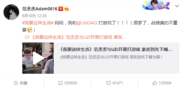 这场游戏过后,范丞丞兴奋地炫耀:“妈妈,我和Uzi打游戏了!(圆梦了,战绩真的不重要)”