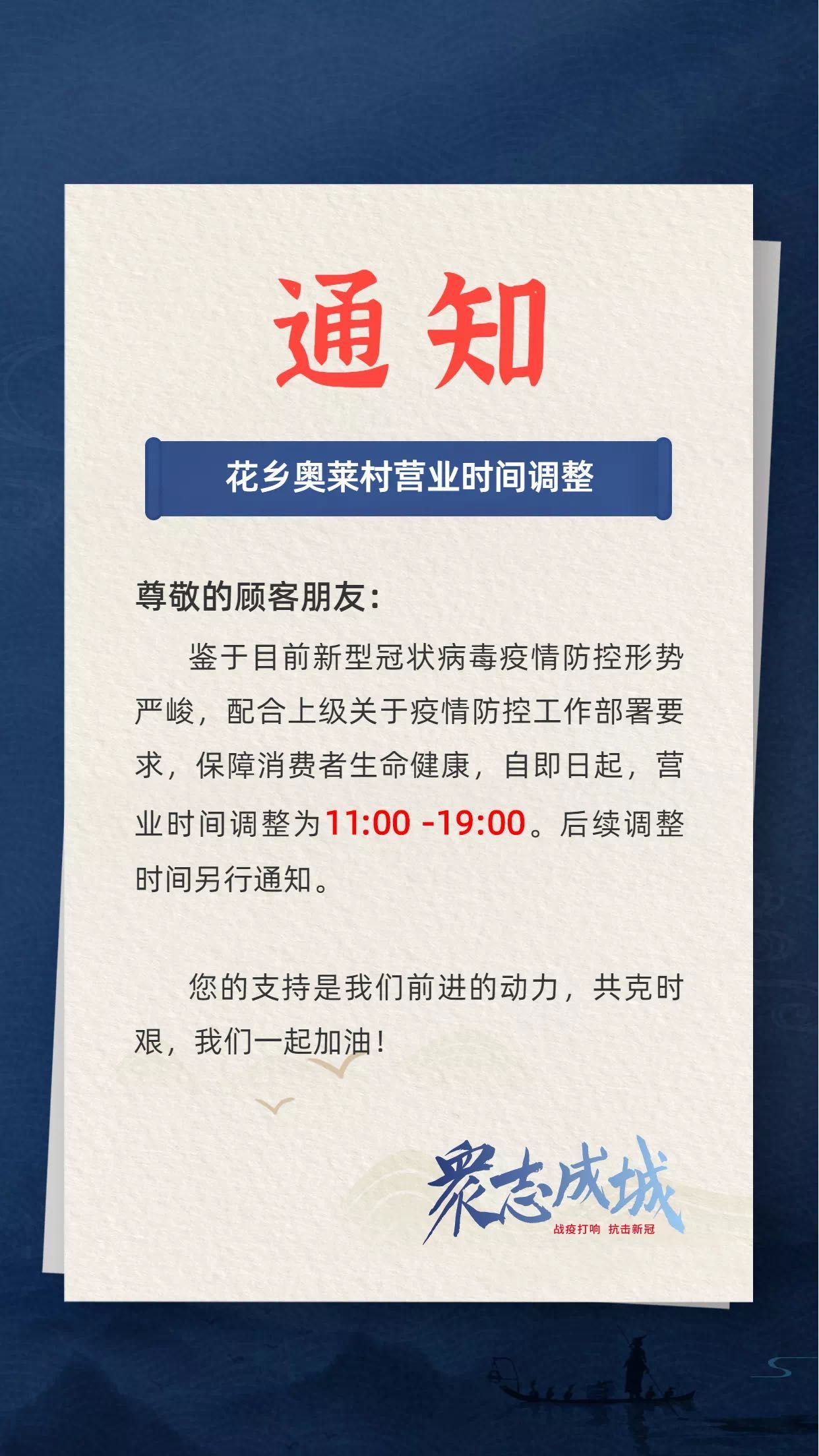 花乡奥莱村发布通知,从即日起营业时间调整为上午11时至晚7时,后续调整时间另行通知。此前花乡奥莱村营业时间为上午10时至晚10时。此外,花乡奥莱村也暂时取消了“父爱如衫”报名投票活动 ,此后恢复时间另行通知。