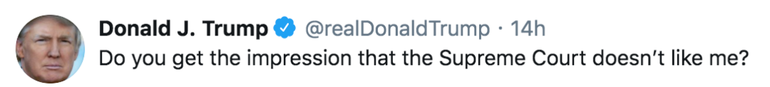 特朗普认为,“最高法院的决定似乎并非基于法律”,甚至在推特上发文称,“最高法院是不是不喜欢我”?