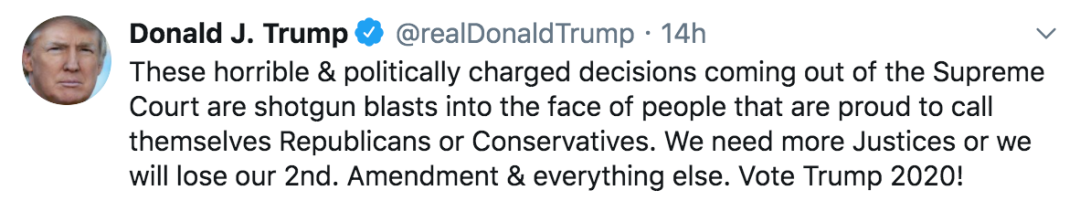 特朗普指出,最高法院的裁决十分“可怕”,并充满了政治色彩,他们正在拿枪对准那些共和党人或者保守派人士的脸。我们需要更多的法官,否则我们就会输掉第二场。2020年给特朗普投票吧!