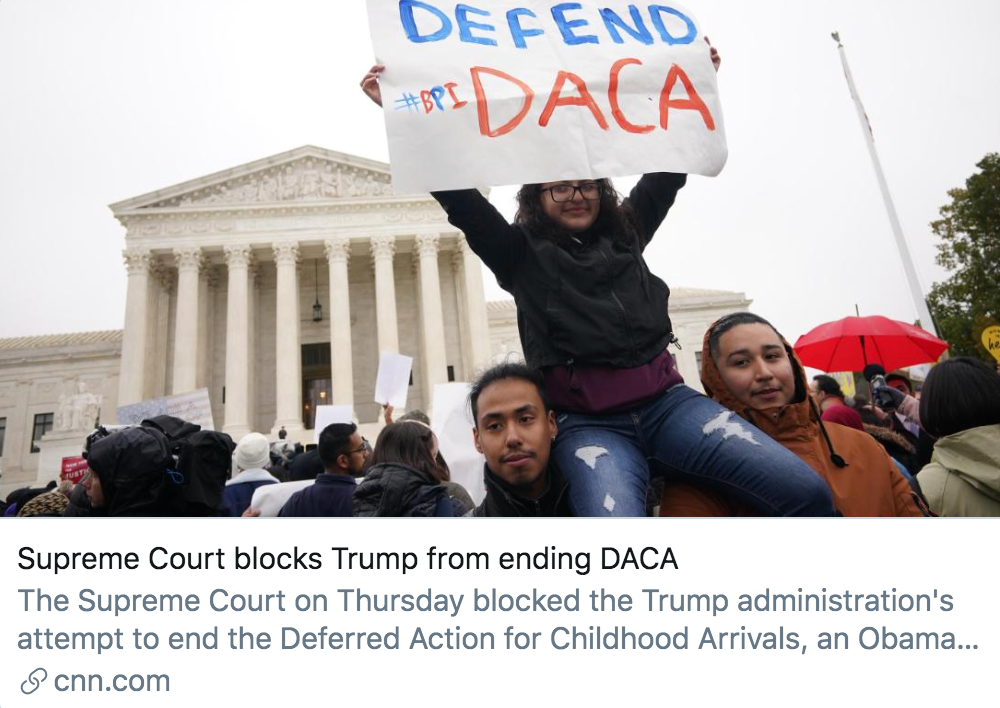 据CNN报道,美国最高法院于6月18日否决特朗普政府废除“童年抵美者暂缓遣返”(DACA)的命令,保护了超65万“梦想生”在美国的生活。