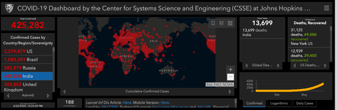 约翰斯·霍普金斯大学新冠肺炎数据。