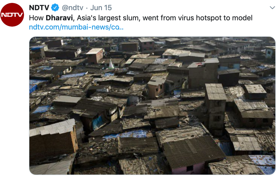报道指出,政府的检测和管控举措帮助控制了达哈维贫民窟疫情的扩散。达哈维贫民窟是印度最大的贫民窟,人口密集、卫生条件差,这里的面积大约1.75平方公里,但居民人数却超过100万。