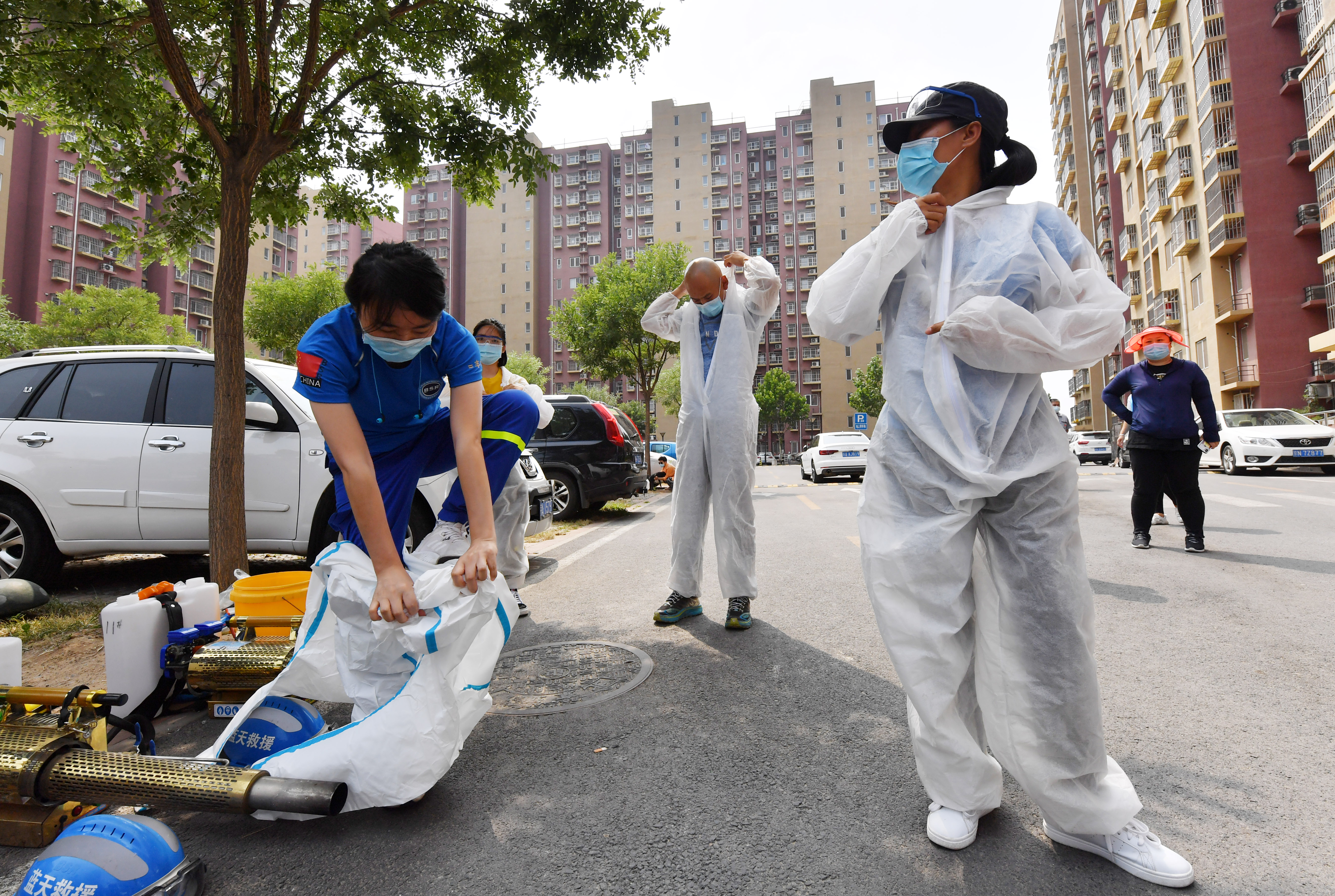 而丰台蓝天救援队的队员们还没来得及休息一天,就又绷紧了弦。队长周旭宏说,6月初大家刚刚结束了各个中小学校园的消杀任务,紧接着就进入了各个市场。任务最重的一天,18名队员在一天时间内对丰台区小瓦窑村附近13个社区,共100多万平米的区域进行消杀,防护服超11小时没脱。
