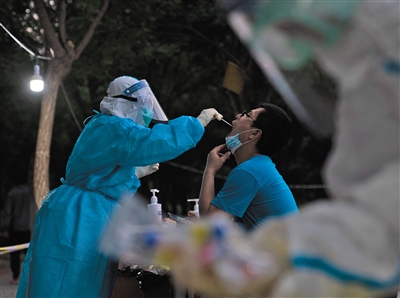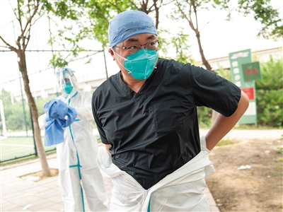 采样工作从下午2点半开始。连日来北京持续高温,尽管四周的树木遮挡了一部分阳光,但很快,汗水就顺着医务人员的额头、发梢流了下来,护目镜起了雾,濡湿的睫毛模糊了视线。