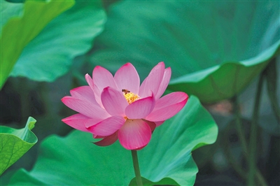场景:一只蜜蜂在盛开的荷花间采蜜。新京报记者 侯少卿 摄