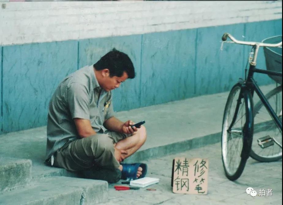 △ 学校里修钢笔的师傅。一些手巧的师傅不但会修钢笔,还写得一手好字,可以在钢笔的塑料杆上刻学生的名字,甚至绘制属相。