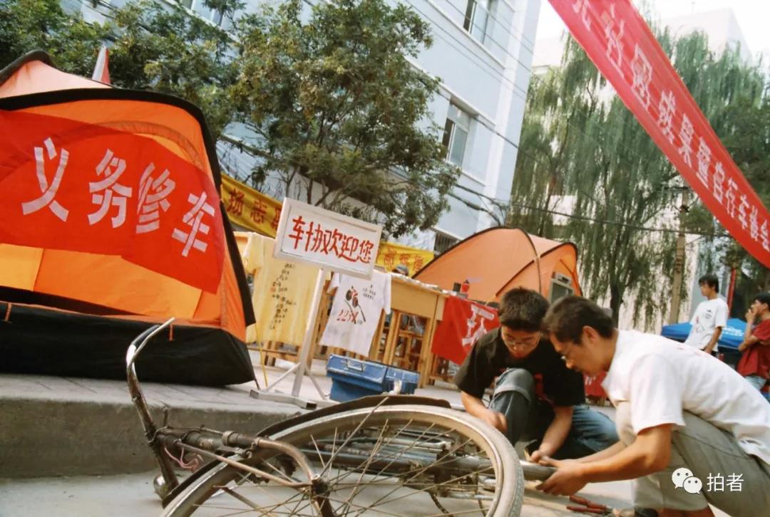△ 学校里最有名的自行车协会的成员在给同学免费修车。他们会在一件T恤衫上画上自己骑行经过的主要城市,还会在当地的邮局,盖一个当日的邮戳。