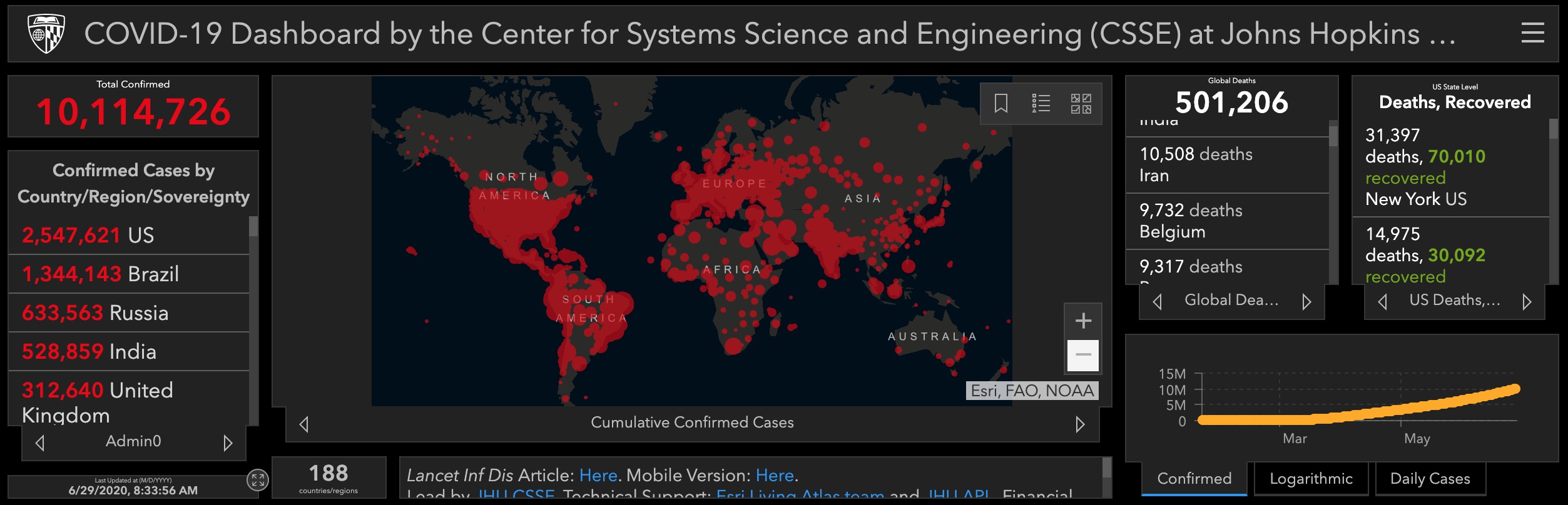 新京报快讯(记者 谢莲)据美国约翰斯·霍普金斯大学统计数据,截至北京时间6月29日8时33分,全球新冠肺炎死亡病例超过50万例,达到了501206例。全球累计新冠肺炎确诊病例超过1000万例,达到10114726例。