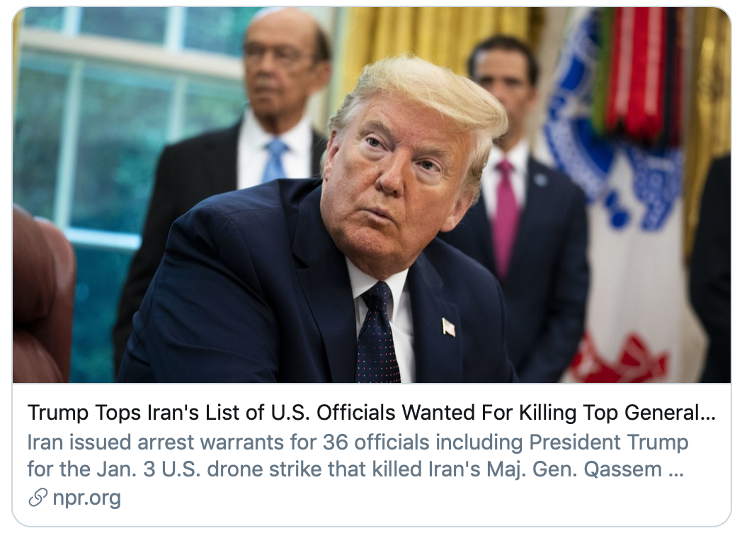 “特朗普成伊朗头号通缉犯”。/NPR报道截图