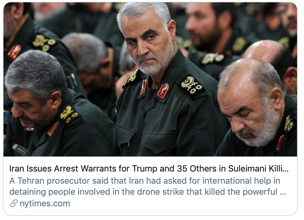 “伊朗对特朗普及其他35人发出逮捕令”。/《纽约时报》报道截图