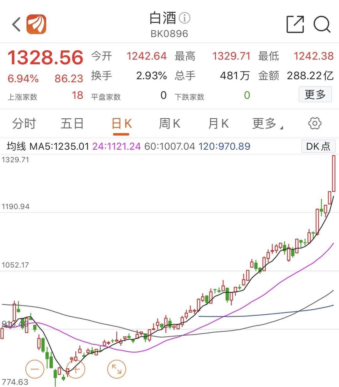 就个股表现而言,贵州茅台、五粮液、泸州老窖、山西汾酒、酒鬼酒、古井贡酒、今世缘、水井坊等8只个股今日股价创出历史新高。其中,老白干酒连续两日涨停,今日报收14.25元,涨幅10.04%;贵州茅台盘中突破1500元,股价再次刷新历史新高,截至收盘报1494.27元,涨幅2.15%,总市值达1.88万亿元,稳居A股第一位。五粮液盘中最高达185.1元,涨幅逾7%,收盘报181.98元,涨幅6.35%,总市值首次突破7000亿元。