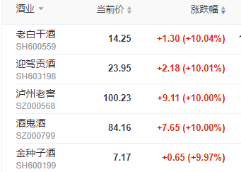 新京报讯(记者 郭铁)7月1日,白酒股延续上涨走势,截至收盘整体涨幅达6.94%,18只股票中有13只涨幅超过5%。其中,老白干酒、迎驾贡酒、酒鬼酒、泸州老窖、金种子酒5只个股触及涨停,8只个股股价创出历史新高;贵州茅台盘中最高站上1506.1元,超过飞天茅台1499元的建议零售价。