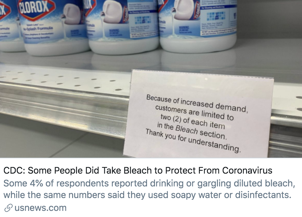 美国疾控中心:一些人通过服用漂白剂来预防感染。/ U.S.News报道截图