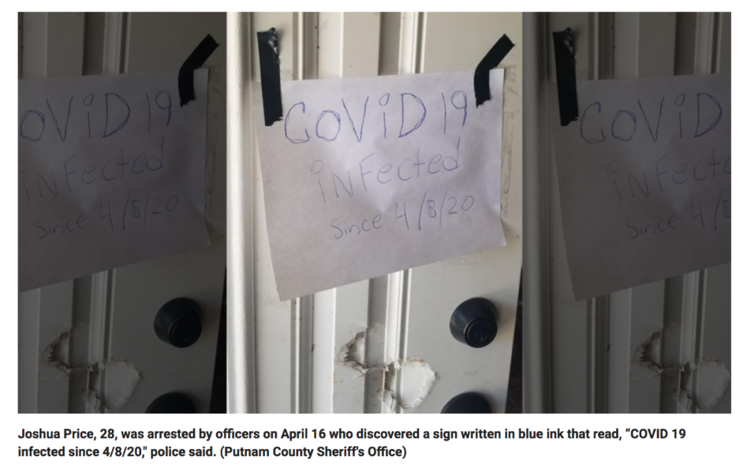 现年28岁的约书亚·普莱斯知道自己已被“通缉”,但很担心被捕,便在门上张贴“自2020年4月8日感染了新冠病毒”的纸条。