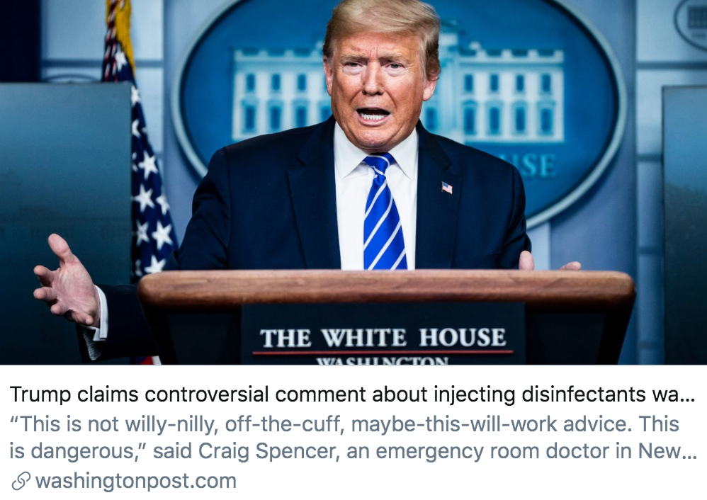 特朗普“注射消毒剂”的言论引发争议。/ 《华盛顿邮报》报道截图