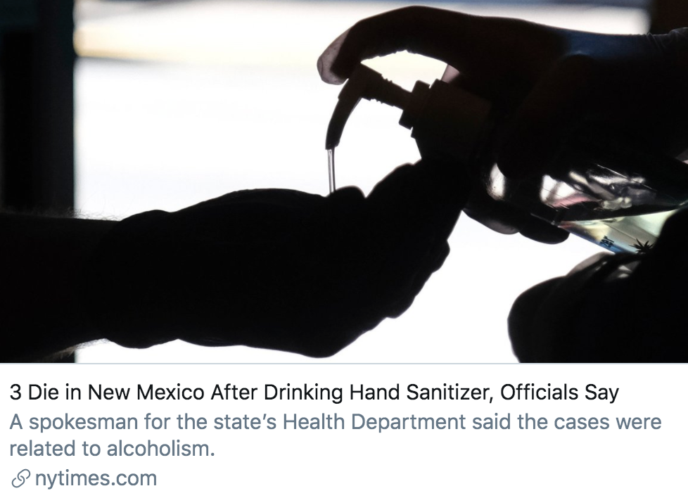 官方证实,新墨西哥州的3人服用洗手液后死亡。/ 《纽约时报》报道截图