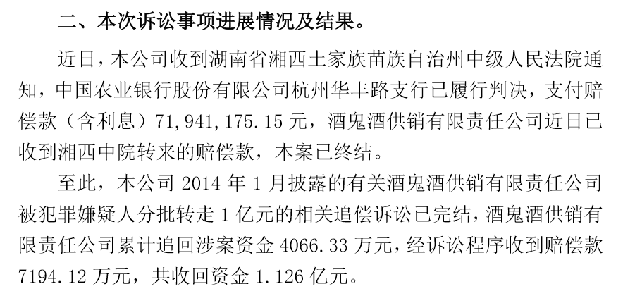 酒鬼酒表示,至此,酒鬼酒于2014年1月披露的,有关酒鬼酒供销有限责任公司被犯罪嫌疑人分批转走1亿元的相关追偿诉讼已完结,酒鬼酒供销有限责任公司累计追回涉案资金4066.33 万元,经诉讼程序收到赔偿款7194.12 万元,共收回资金1.126 亿元。