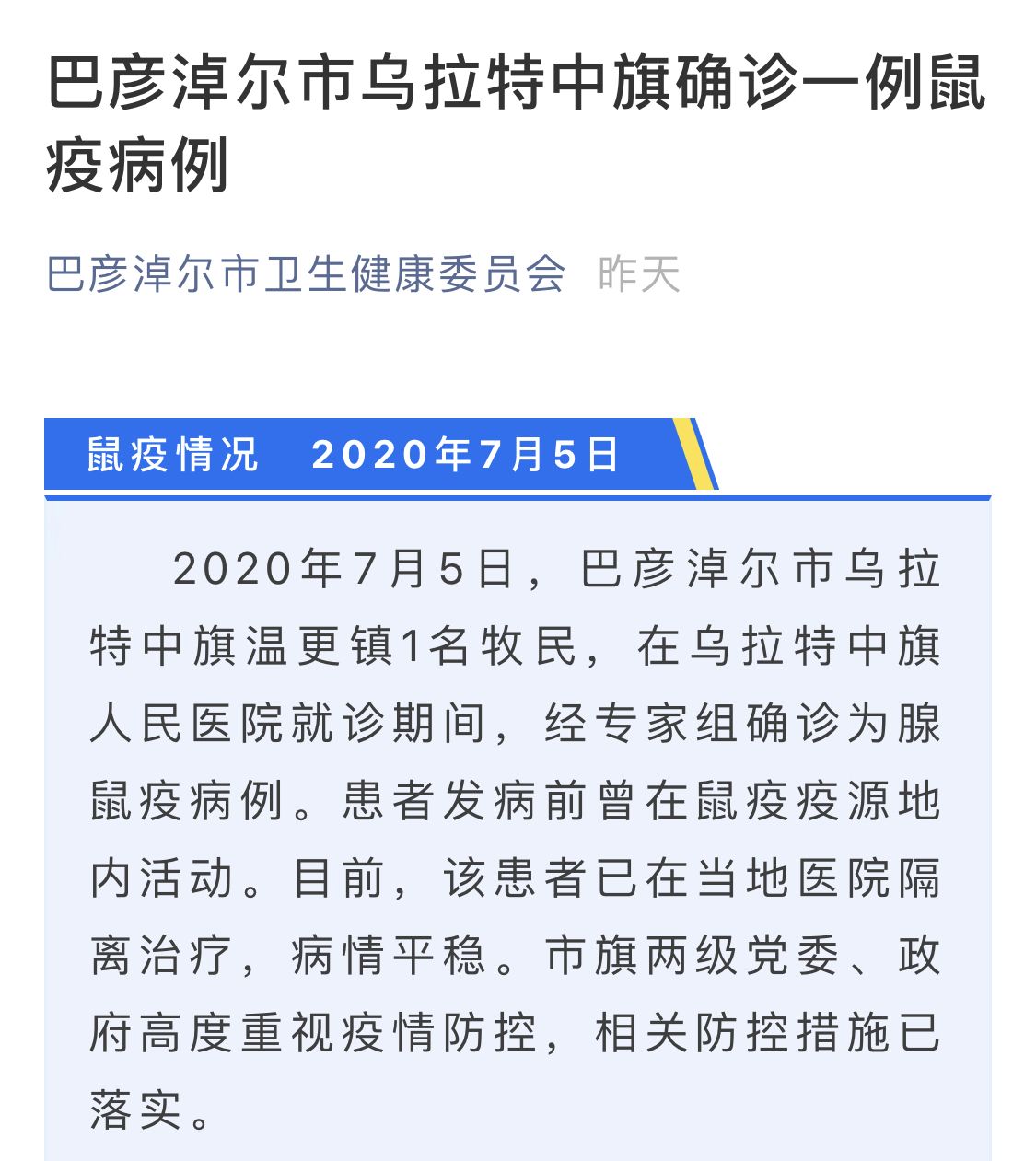 7月5日,巴彦淖尔市卫健委官方微信号发布通报,称4日由乌拉特中旗医院上报的疑似鼠疫病例经专家组确诊为腺鼠疫病例。