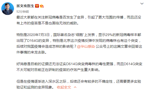 张文宏:目前无证据证实D614G变异毒株毒性更强