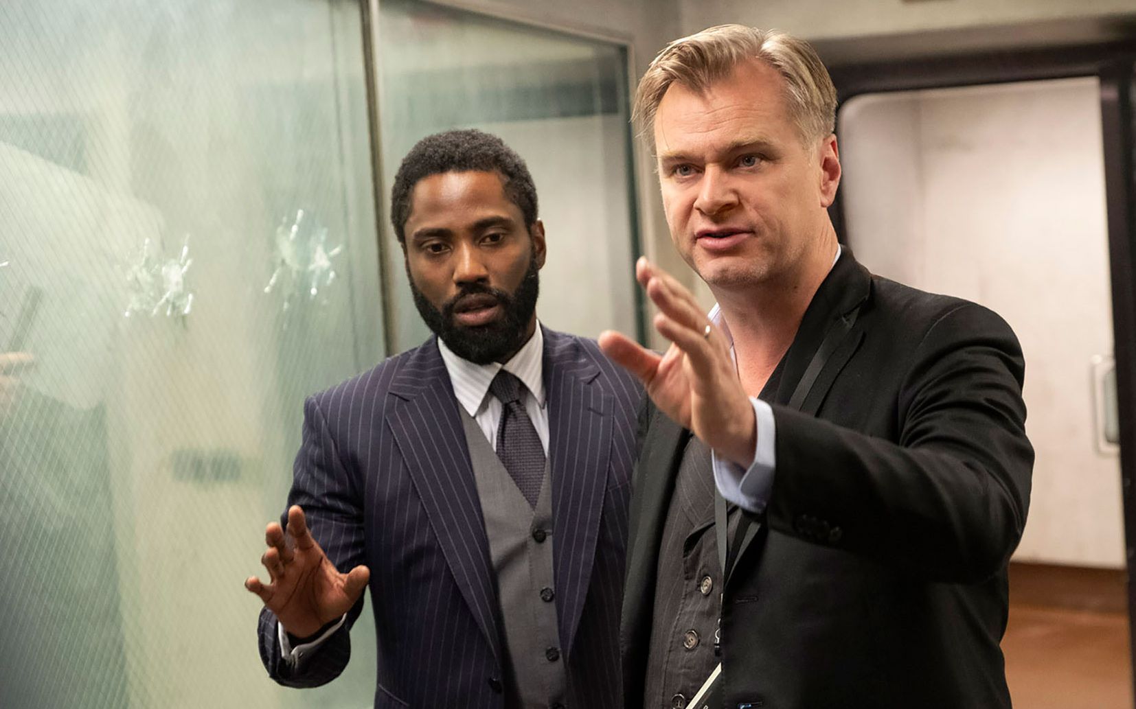 《信条》主演约翰·大卫·华盛顿(左)和导演诺兰在拍摄现场。