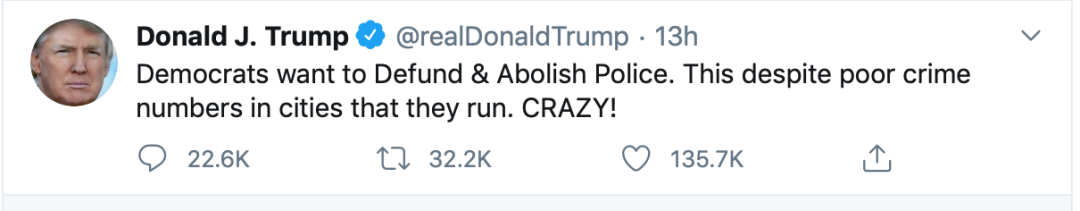 特朗普一直反对撤销警察部门或削减资金。7月5日,他还在推特上称,“民主党人希望削减资金、撤销警局,尽管他们掌控的城市犯罪率非常糟糕。太疯狂了!”