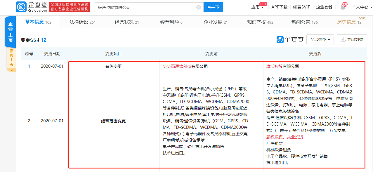 新京报贝壳财经讯 企查查显示,7月1日,步步高通信科技有限公司企业名称发生变更,变更为维沃控股有限公司,同日该公司经营范围新增股权投资、实业投资。