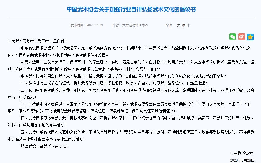 7月9日,中国武术协会发布《关于加强行业自律 弘扬武术文化的倡议书》,其中提出:不得自封“大师”“掌门”“正宗”“嫡传”等称号。不得以武术拳种、门派名义参加综合格斗、自由搏击等搏击类赛事,不参加不分项目、性别、年龄、体重级别等不规范赛事活动。”