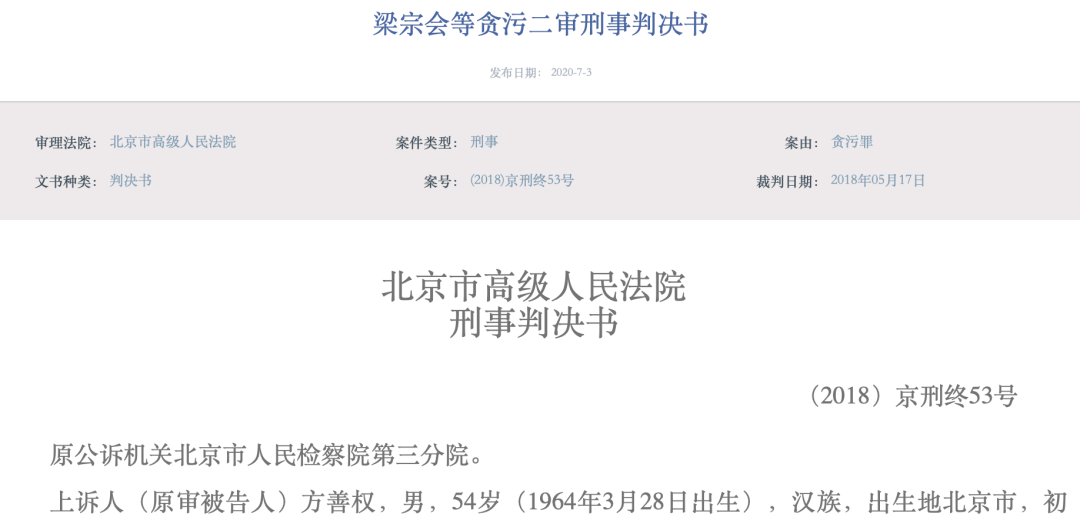 今年7月3日,北京法院审判信息网公开了梁宗会等贪污二审刑事判决书,裁判日期为2018年5月17日。