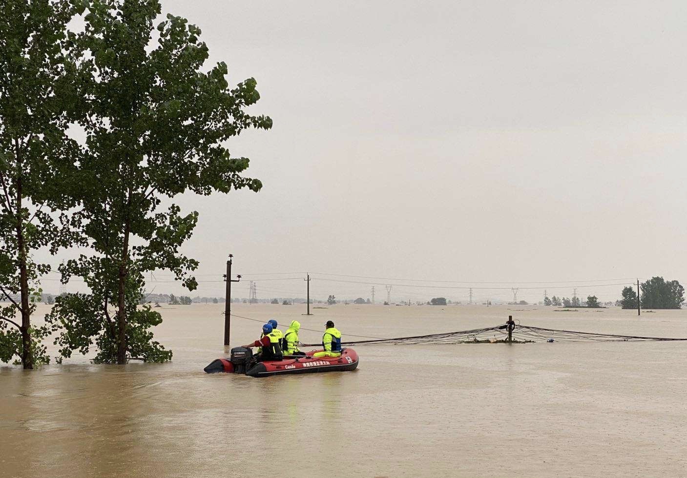 在马达轰鸣声中,载着救援人员的冲锋舟划开浑黄的洪水,向远处水面露出的斑驳楼顶冲过去。