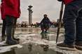 此次展览预计将向公众开放三个月。图为观众在参观山东皮影。