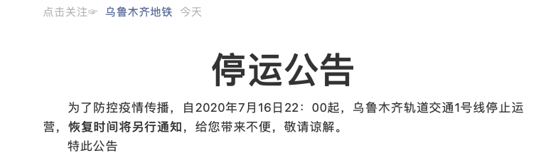 新京报快讯 据乌鲁木齐地铁微信公众号消息,为了防控疫情传播,自2020年7月16日22:00起,乌鲁木齐轨道交通1号线停止运营,恢复时间将另行通知。
