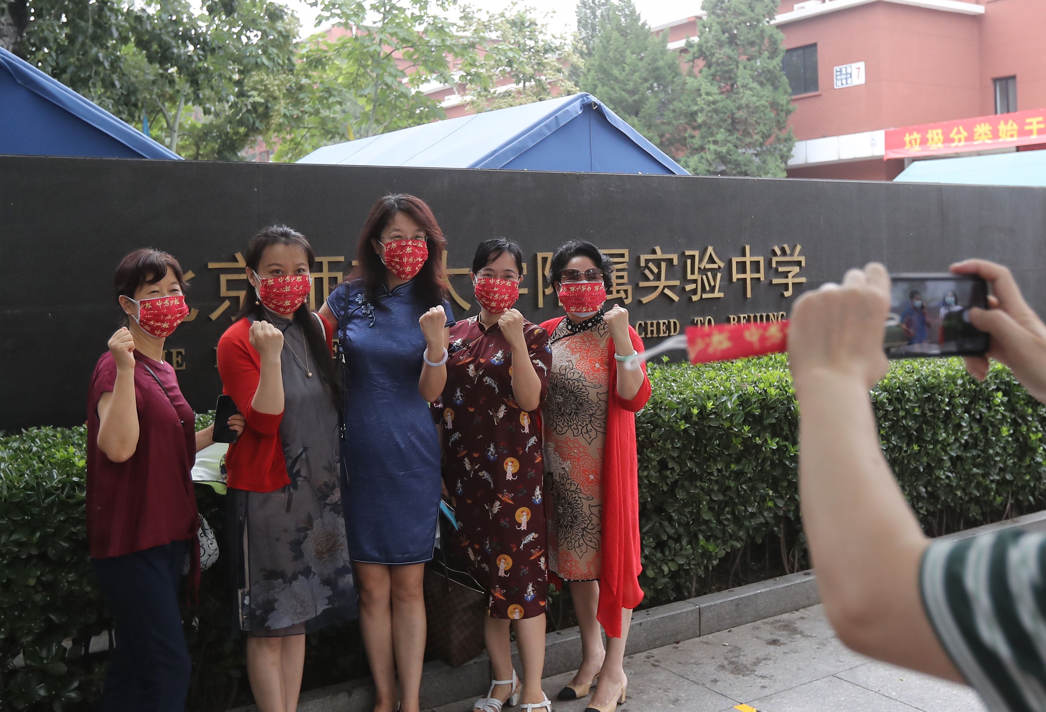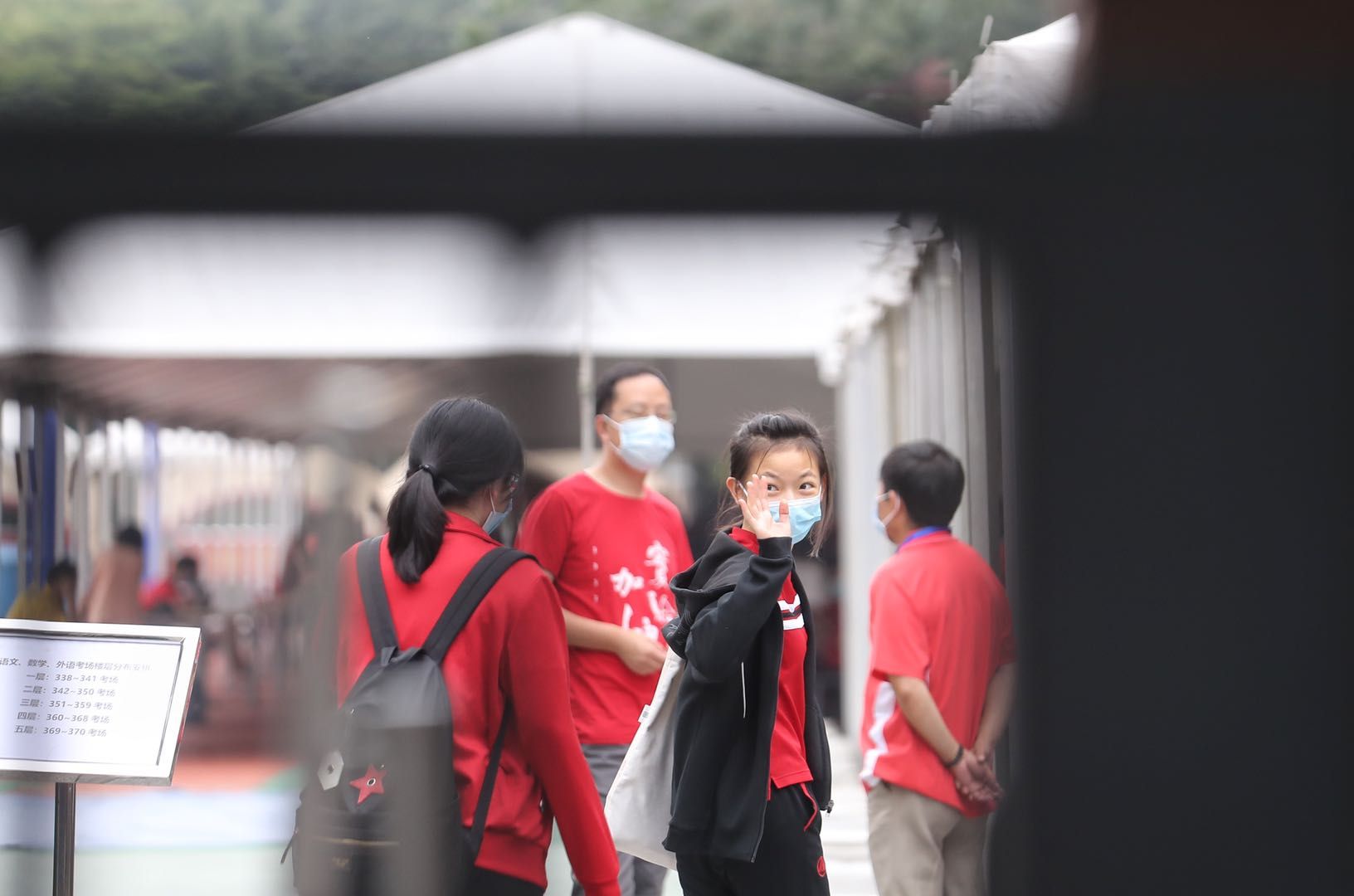 不少送考家长除了身着红色衣服以外,还特别定制了红色的“中考加油”送考口罩。摄影/新京报记者 王贵彬