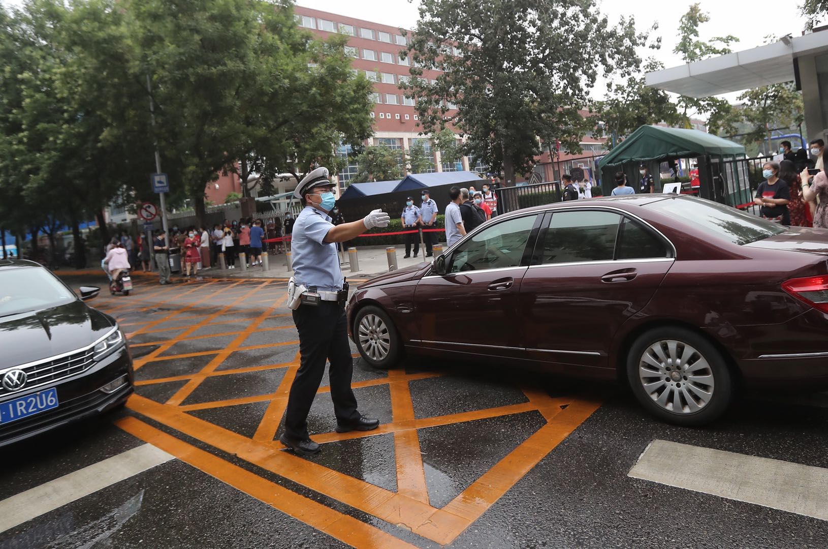 西城交通支队府右街大队的民警提前在校门前上岗执勤,疏导交通,提醒送考家长车辆即停即走。摄影/新京报记者 王贵彬
