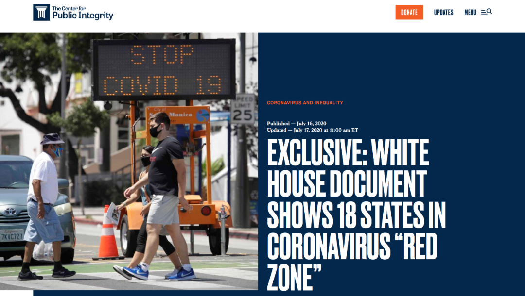 根据这份文件,加利福尼亚州、得克萨斯州及佐治亚州等18个疫情严重地区被列为“红色区域”,这些州在7月7日至14日期间,每10万人的平均确诊数量超过100人。除此之外,这份文件还标注了10个“检测阳性率红区”。这意味着在过去的一周时间里,上述地区的新冠病毒检测阳性率超过了10%。