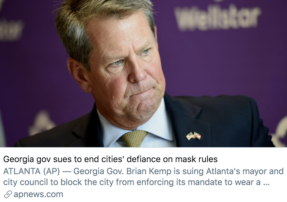 州政府与地方政府也就是否颁布“口罩令”的问题发生争执。当地时间7月16日,佐治亚州共和党籍州长布赖恩·肯普起诉亚特兰大市市长凯莎·兰斯·博顿斯颁布的“口罩令”,违反州一级的紧急指令。