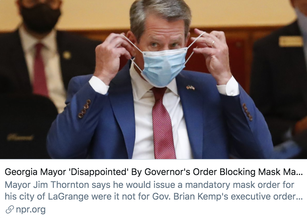 佐治亚州部分官员对肯普的行为十分愤怒,各地纷纷颁布了自己的“口罩令”。截至目前,佐治亚州至少有15个市县已要求民众佩戴口罩。