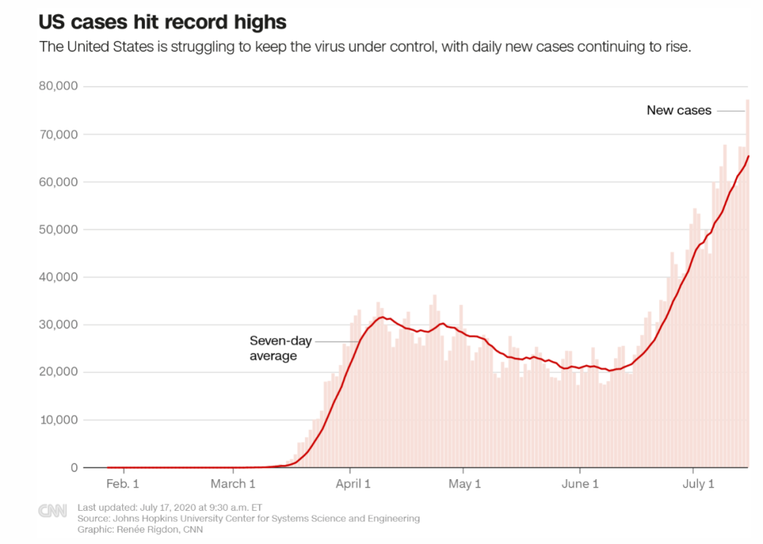 美国新增病例曲线图。CNN网站截图