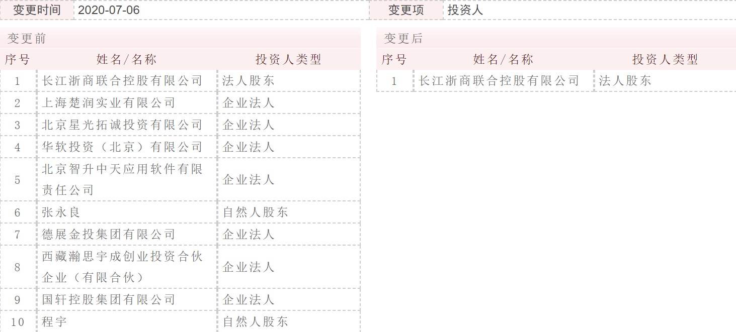 长江文化体育发展有限公司(下称“长江文体”)工商信息显示,其于7月6日发生投资人变更,十家股东中九家退出,目前长江文体由长江浙商联合控股有限公司独资持有。