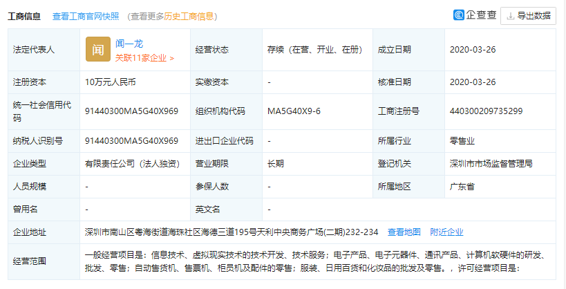 企查查显示,被处以罚单的公司全称为深圳悦来悦爱科技有限公司,该公司成立于今年3月26日,唯一股东为宁波雾芯信息科技有限公司,实缴出资额为10万元。