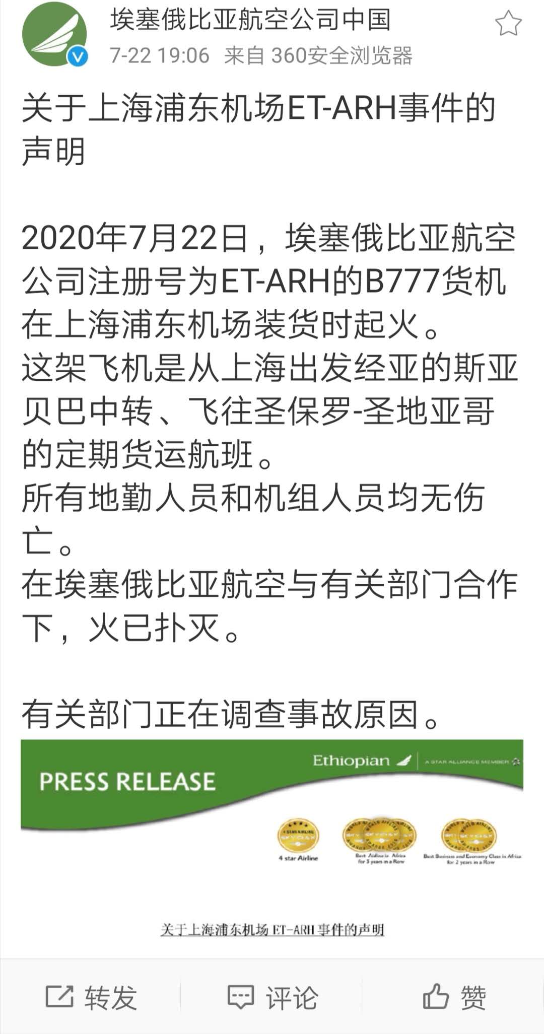 新京报快讯(记者 吴婷婷)今天(7月22日),埃塞俄比亚航空发布声明称,该航空公司注册号为ET-ARH的B777货机在上海浦东机场装货时起火。