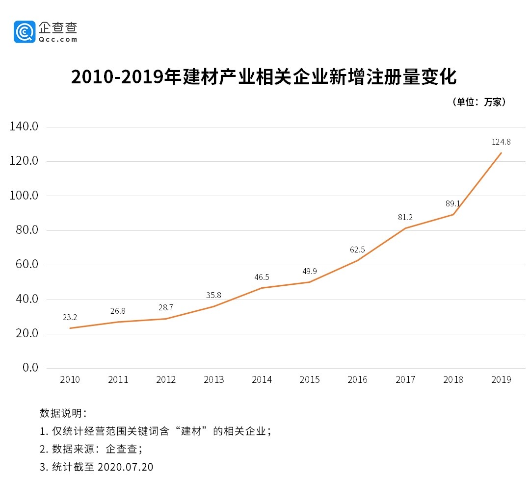 企查查数据显示,建材产业相关企业注册量在近十年间直线上升。2010年开始,建材产业相关企业注册量便缓步抬升。2019年注册量创下十年来的新高,达到124.8万家,同比增长40%。