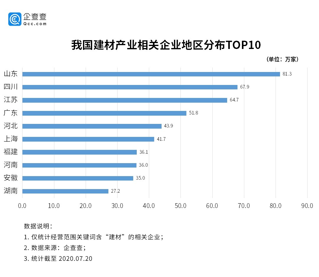企查查数据显示,我国目前共有建材相关企业543.7万家,2019年新增企业达到124.8万家,同比增长40%。从地区分布来看,山东省以81万家企业排名第一,四川、江苏分列二、三名。