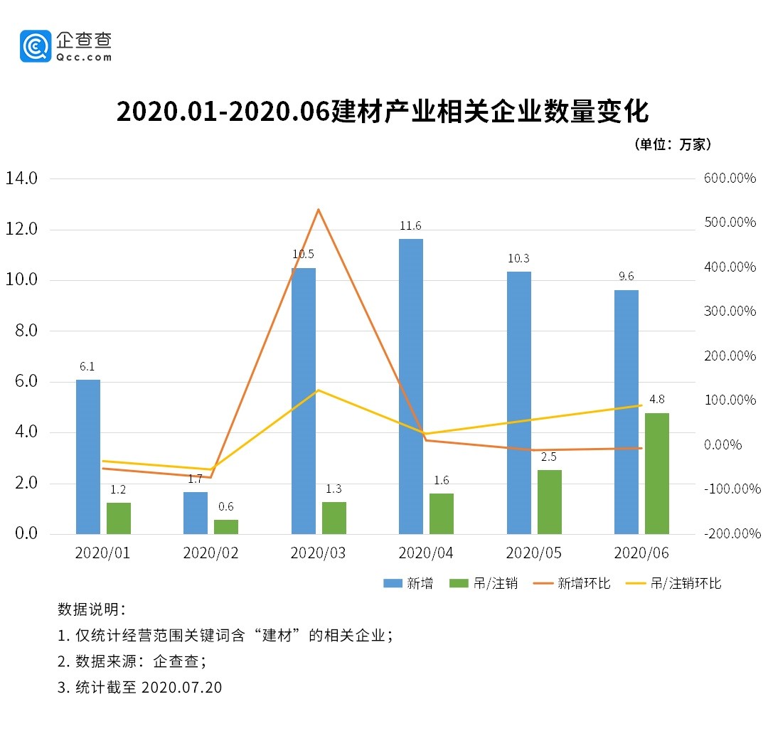 自疫情暴发以来,建材产业相关企业也陷入生产难、开工难的境地。近半年来,我国建材产业相关的企业新注册量超过49万家,其中4月份注册量最多,达到11.6万家,环比增长10.78%。后疫情时期,相关企业注销、吊销数量持续走高,企查查数据显示,今年6月建材产业相关企业注/吊销数量达到4.8万家,环比增长89%。