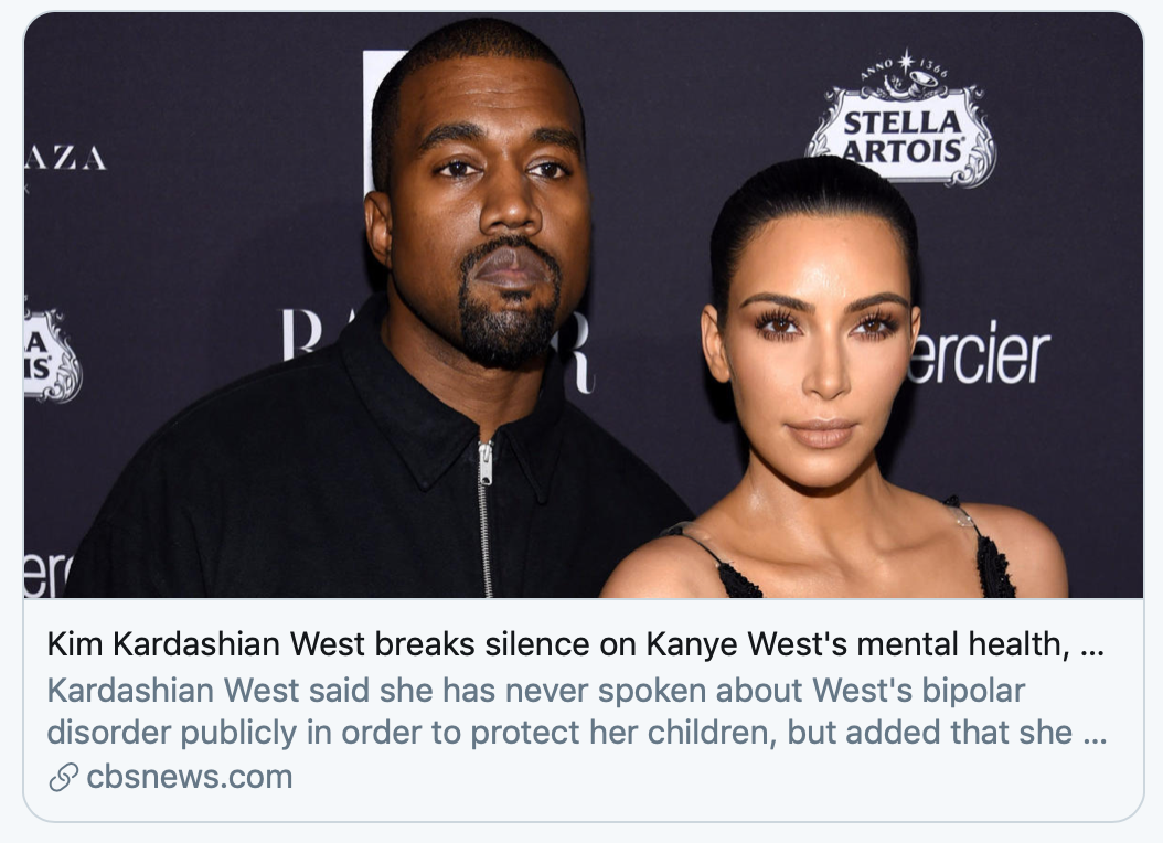 “就像你们很多人了解到的,坎耶患有躁郁症。患有这种病或者身边有患有这种病的人都知道,这是非常复杂且痛苦的”,卡戴珊写到,“我从未公开谈过这一点对我们家庭的影响,因为我想保护我们的孩子和坎耶的隐私。但由于近期出现的对心理健康的误解、污名,我觉得我应该谈下这个问题”。