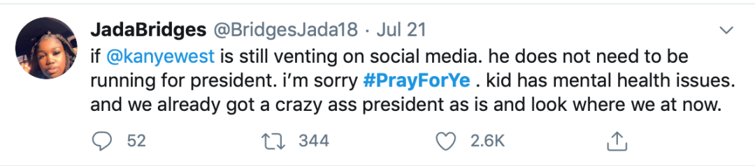 目前,推特上“为侃爷祈祷”(#PrayForYe)热度不断增加,许多网友开始关心他的心理健康问题。有网友称,“为侃爷感到遗憾,他有心理健康问题”,“但我们已经有一位疯狂的总统,看看我们的现状”。