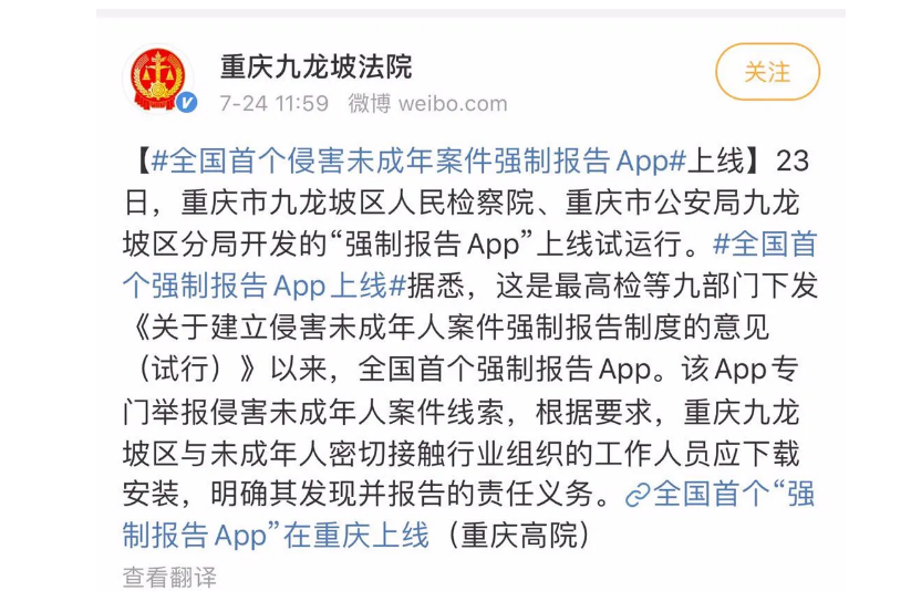 7月23日,重庆市九龙坡区人民检察院与重庆市公安局九龙坡区分局开发的“强制报告App”上线试运行。重庆市检察院同时进行科普,就强制报告的相关信息进行了细致解释。据了解,这也是全国首个强制报告App。